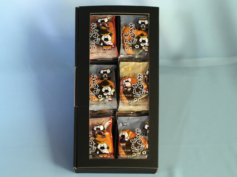 むすび丸のパッケージに、かわいいおむすび型の海苔付きしょうゆせんべいが入っています。